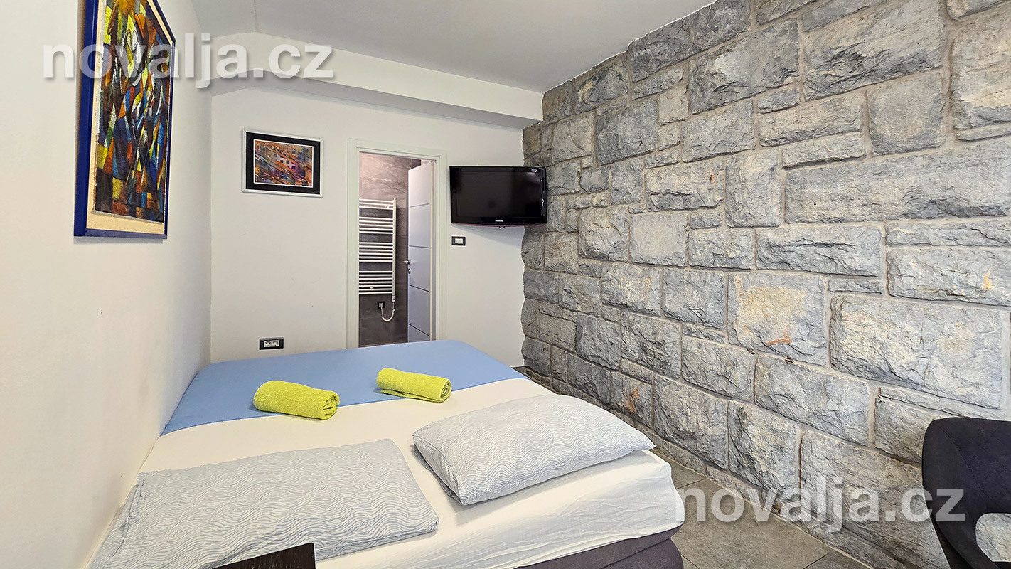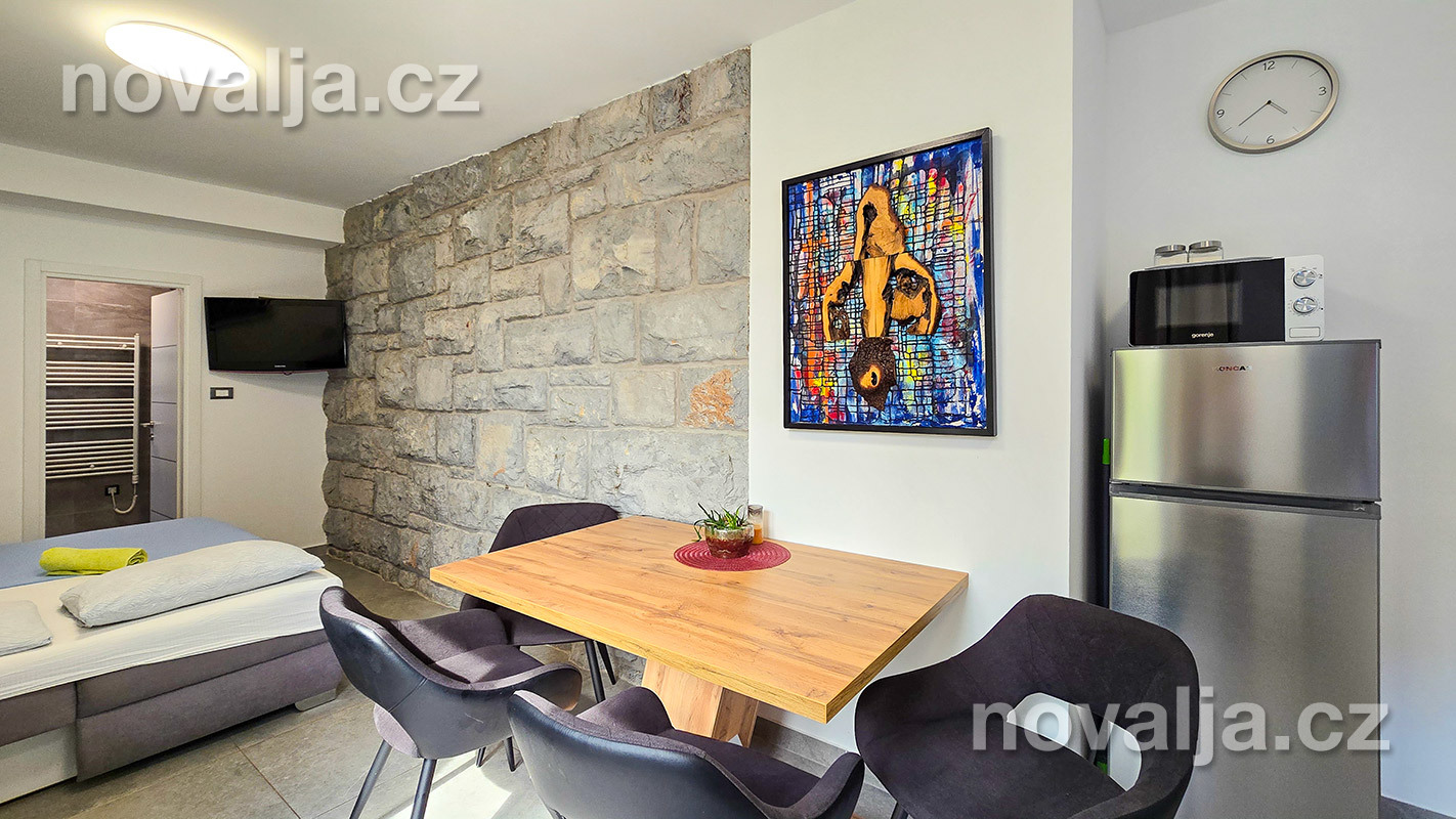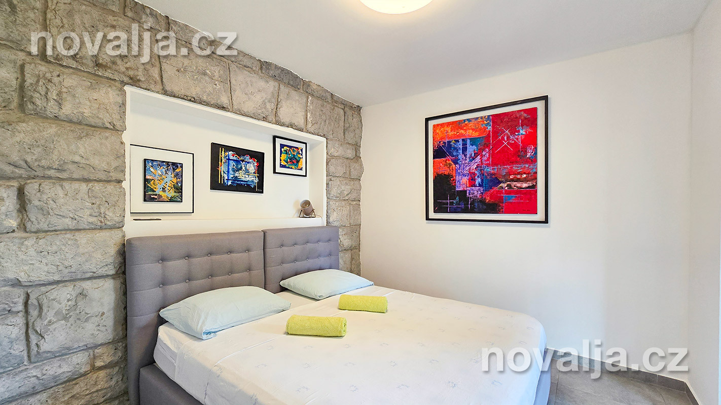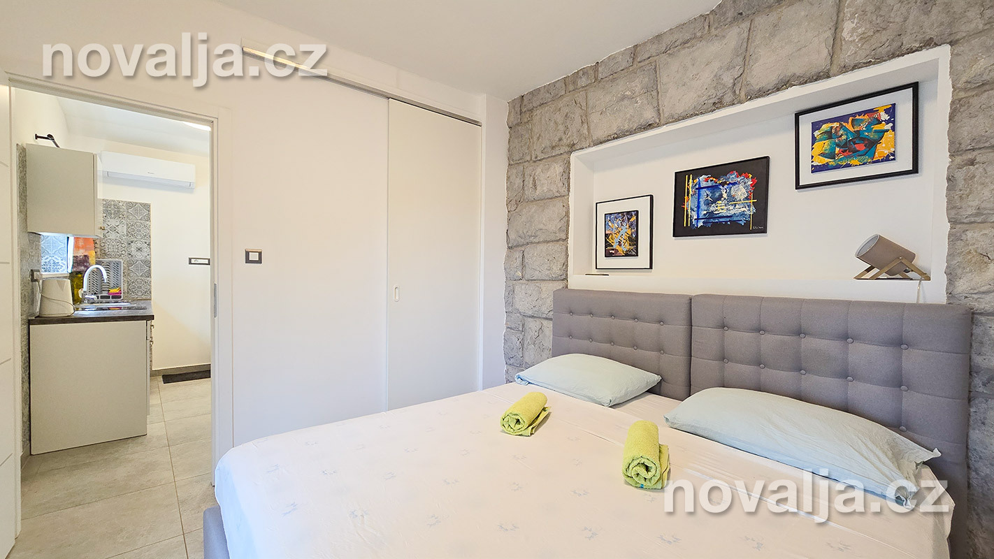 1 spálňa s dvoma lôžkami, vybavená kuchyňa (chladnička, mraznička, mikrovlnná rúra, varná kanvica) s rozkladacím gaučom pre 1–2 osoby, LCD TV+Netflix, sociálne zariadenie so sprchovacím kútom a WC, práčka, terasa so záhradným nábytkom, letná kuchyňa s plynovým grilom. Klimatizácia v kuchyni (v cene).