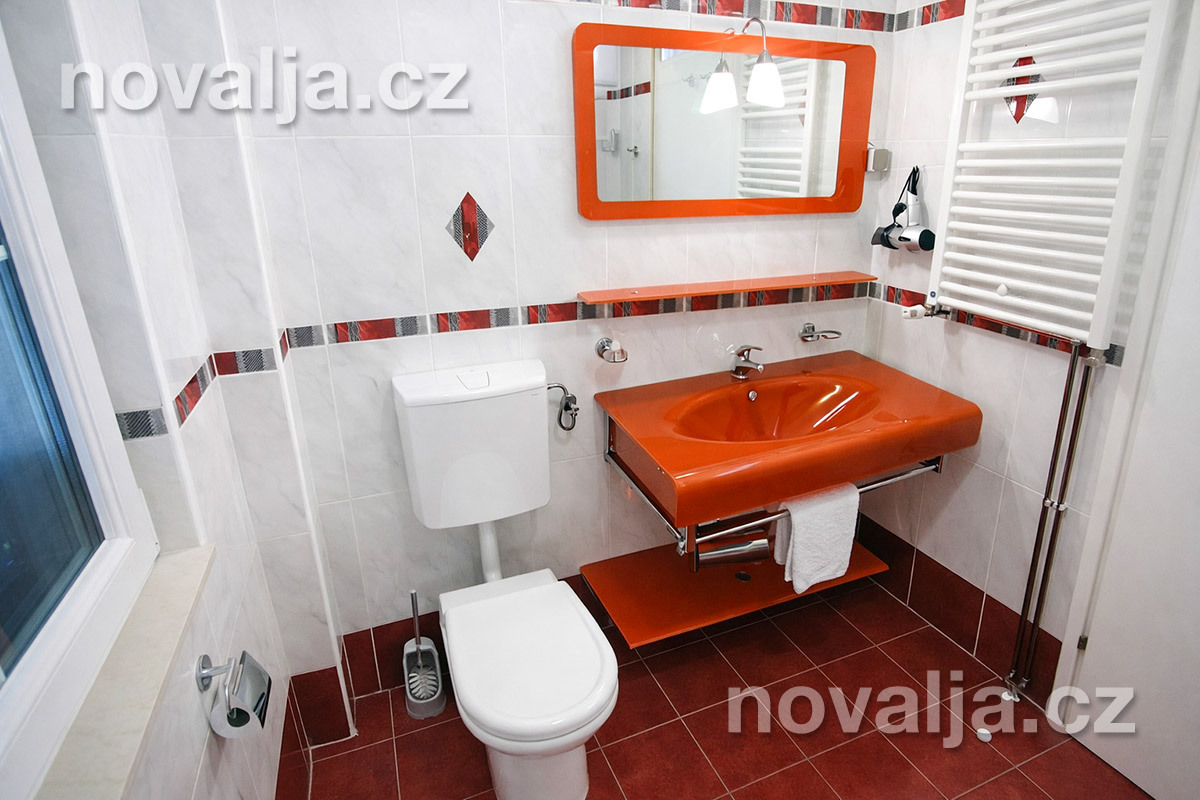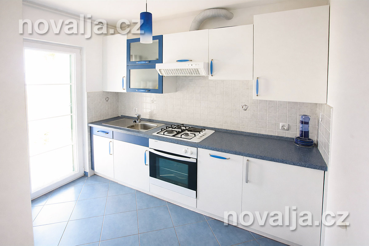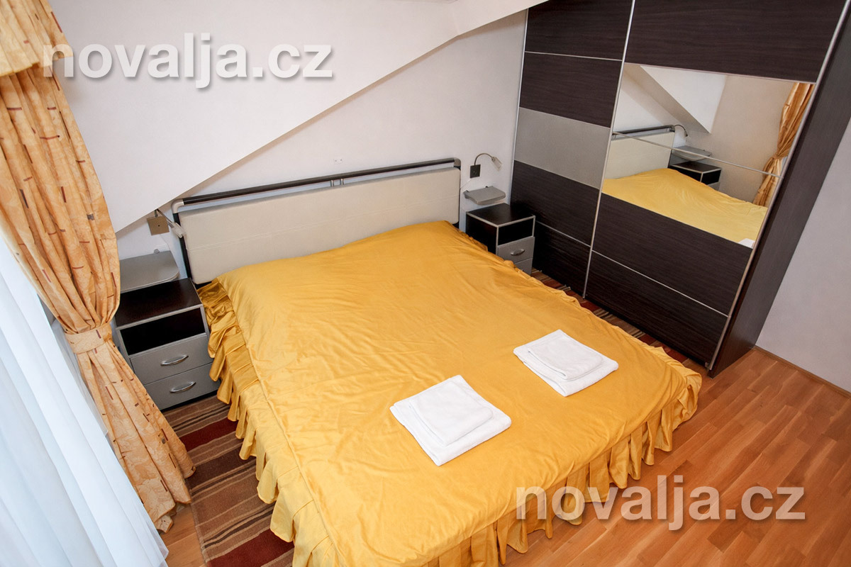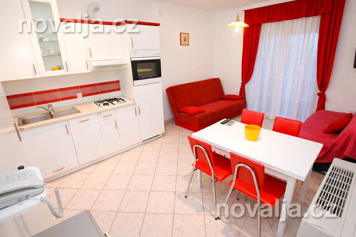 1 spálňa s dvoma lôžkami, vybavená kuchyňa (chladnička, rúra, umývačka, varná kanvica) s dvoma rozkladacími gaučmi pre 1–2 osoby, TV+SAT, fén, sociálne zariadenie so sprchovacím kútom a WC, terasa. Klimatizácia (v cene).