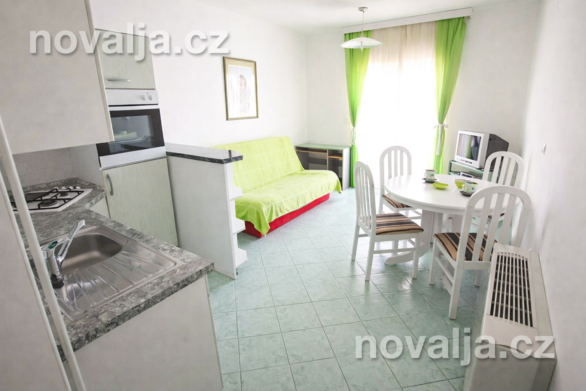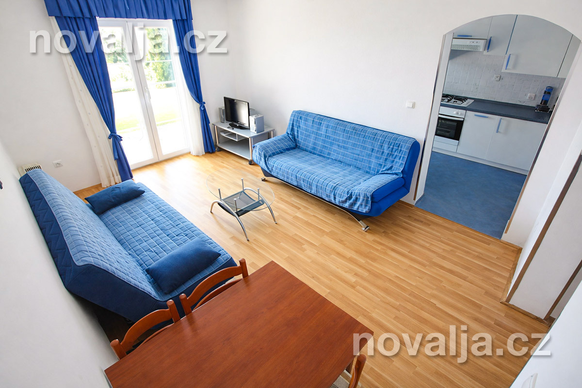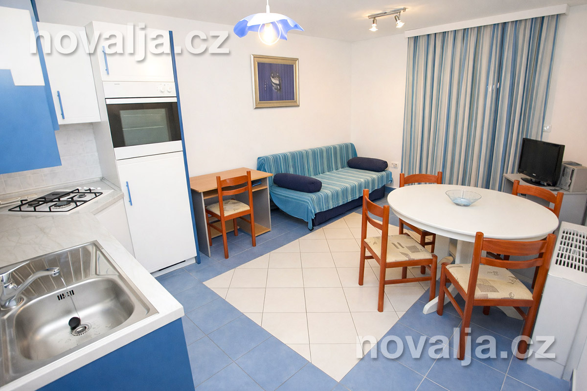1 spálňa s dvoma lôžkami, vybavená kuchyňa (chladnička, rúra, umývačka, varná kanvica) s dvoma rozkladacími gaučmi pre 1–3 osoby, TV+SAT, fén, sociálne zariadenie s vaňou a WC, terasa. Klimatizácia (v cene).