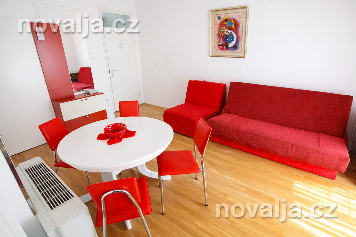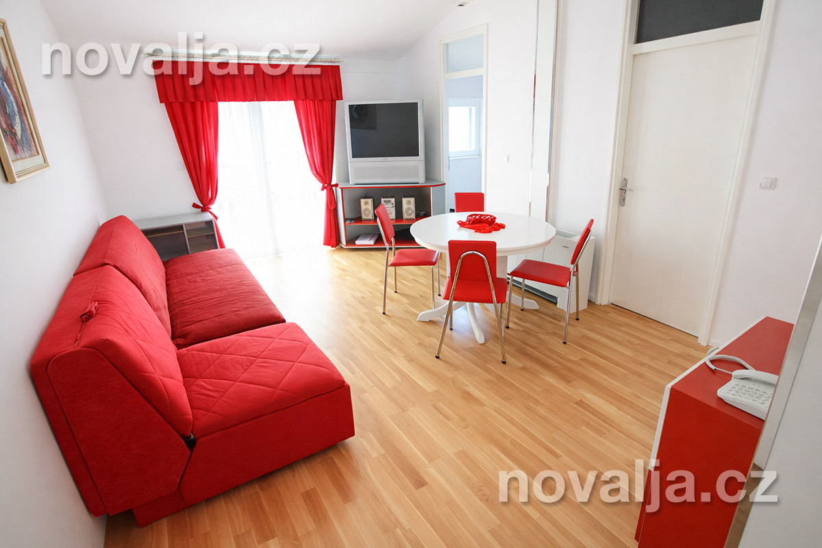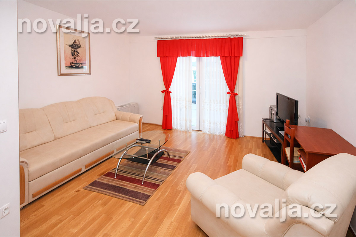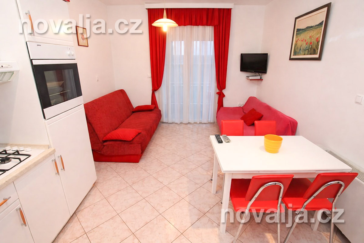 1 spálňa s dvoma lôžkami, vybavená kuchyňa (chladnička, rúra, umývačka, varná kanvica) s dvoma rozkladacími gaučmi pre 1–3 osoby, TV+SAT, fén, sociálne zariadenie s vaňou a WC, terasa. Klimatizácia (v cene).