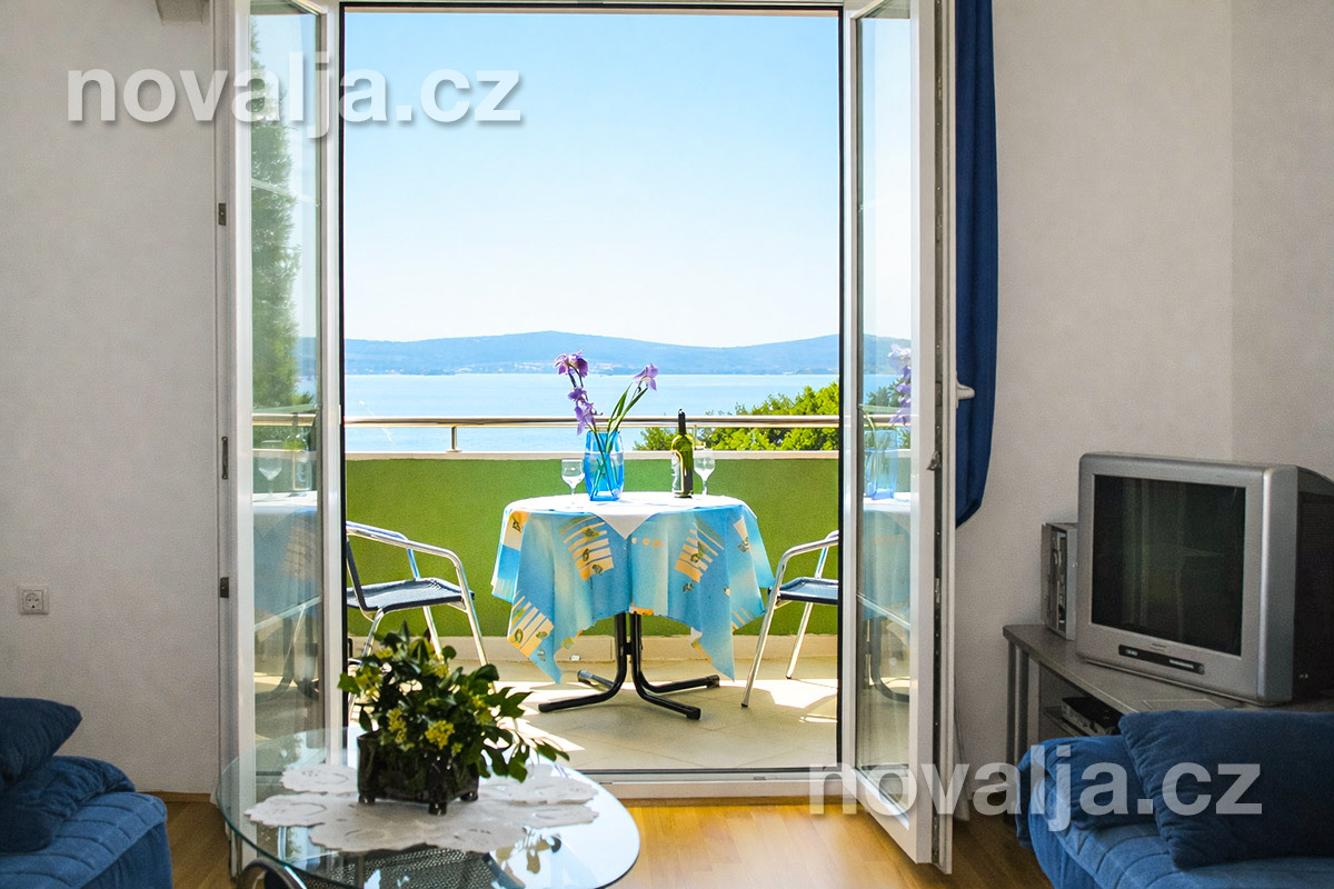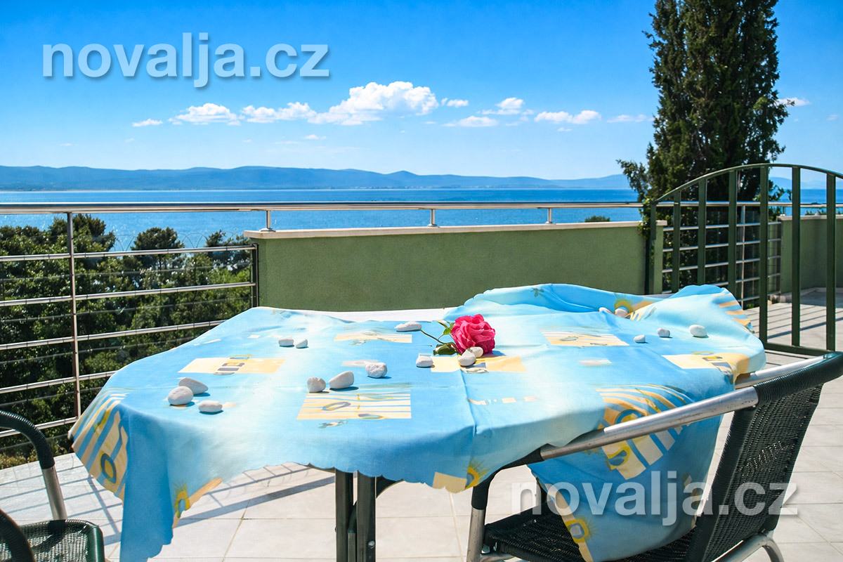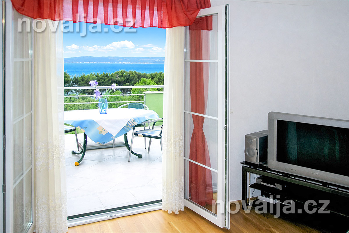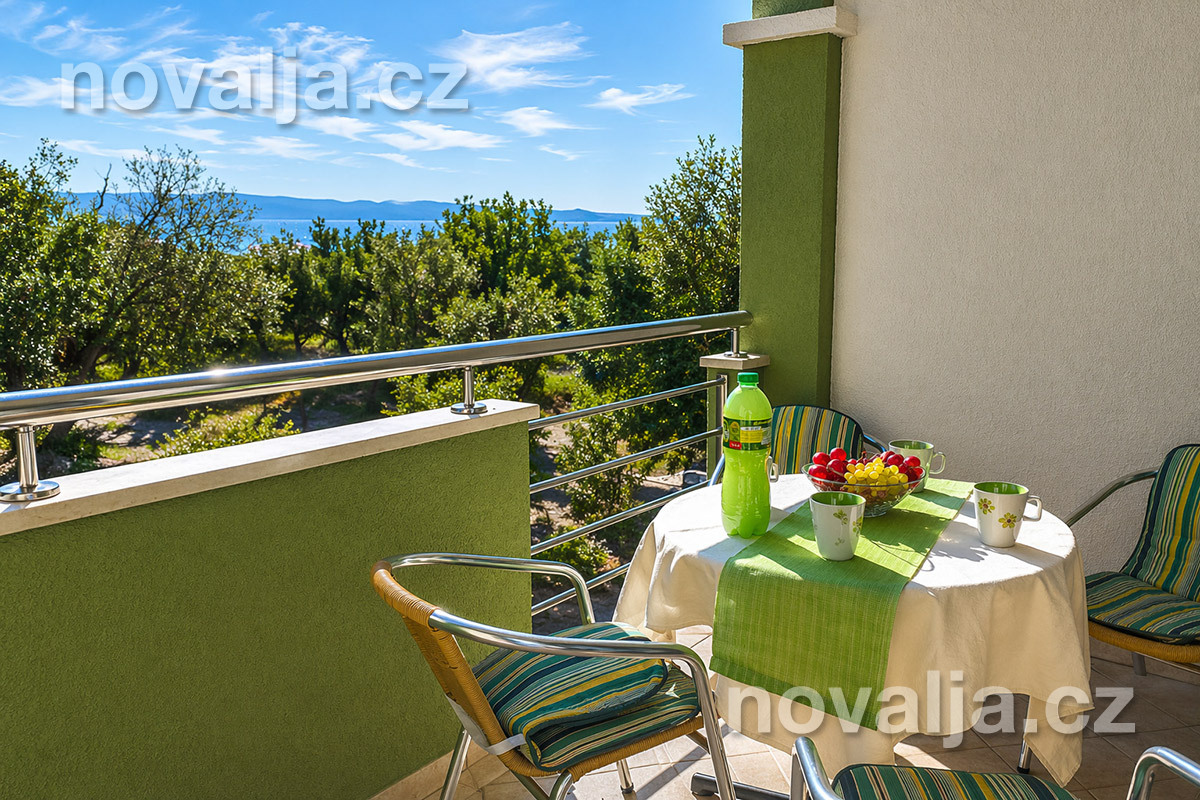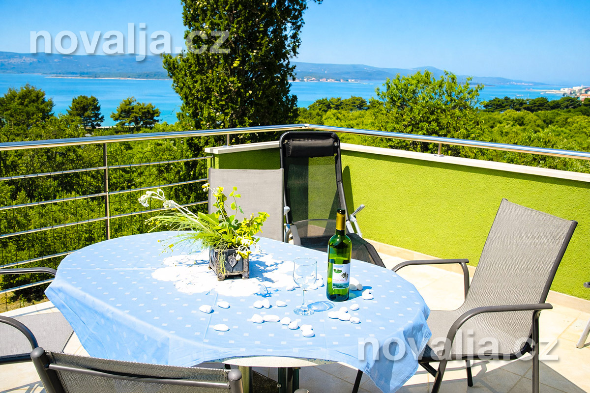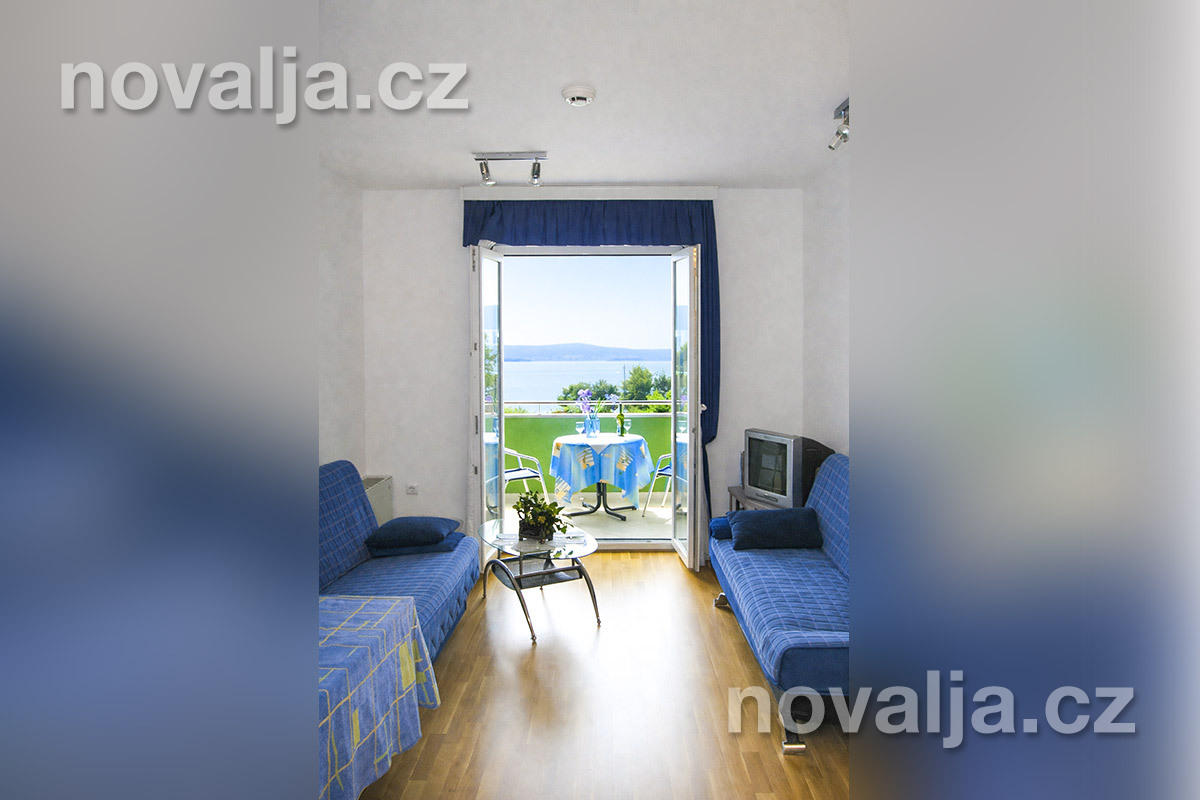 1 spálňa s dvoma lôžkami a rozkladacím gaučom pre 1 osobu, vybavená kuchyňa (chladnička, rúra, umývačka, varná kanvica) s rozkladacím gaučom a rozkladacím kreslom pre 1–2 osoby, TV+SAT, fén, sociálne zariadenie s vaňou a WC, terasa s krásnym výhľadom na more. Klimatizácia (v cene).