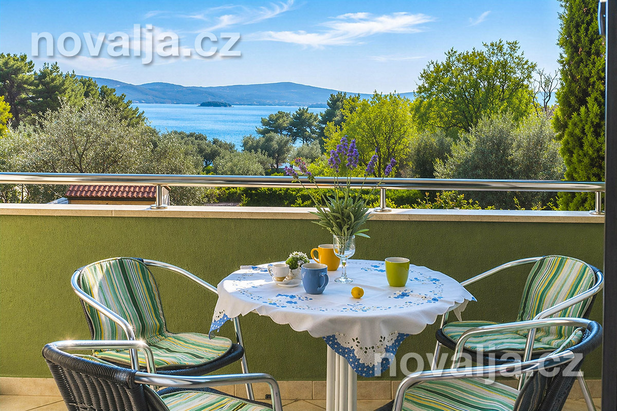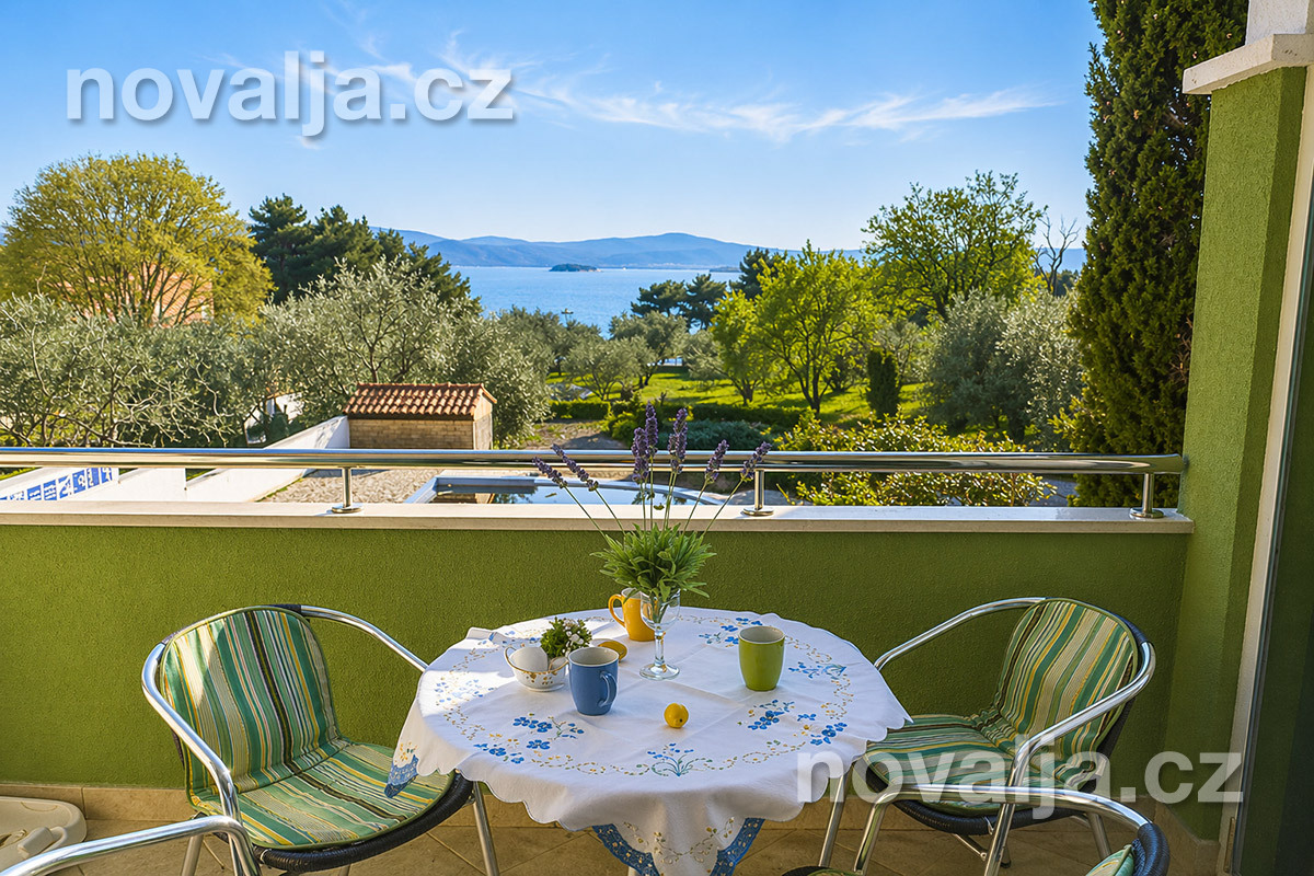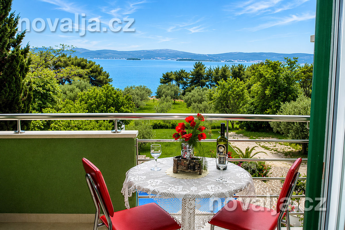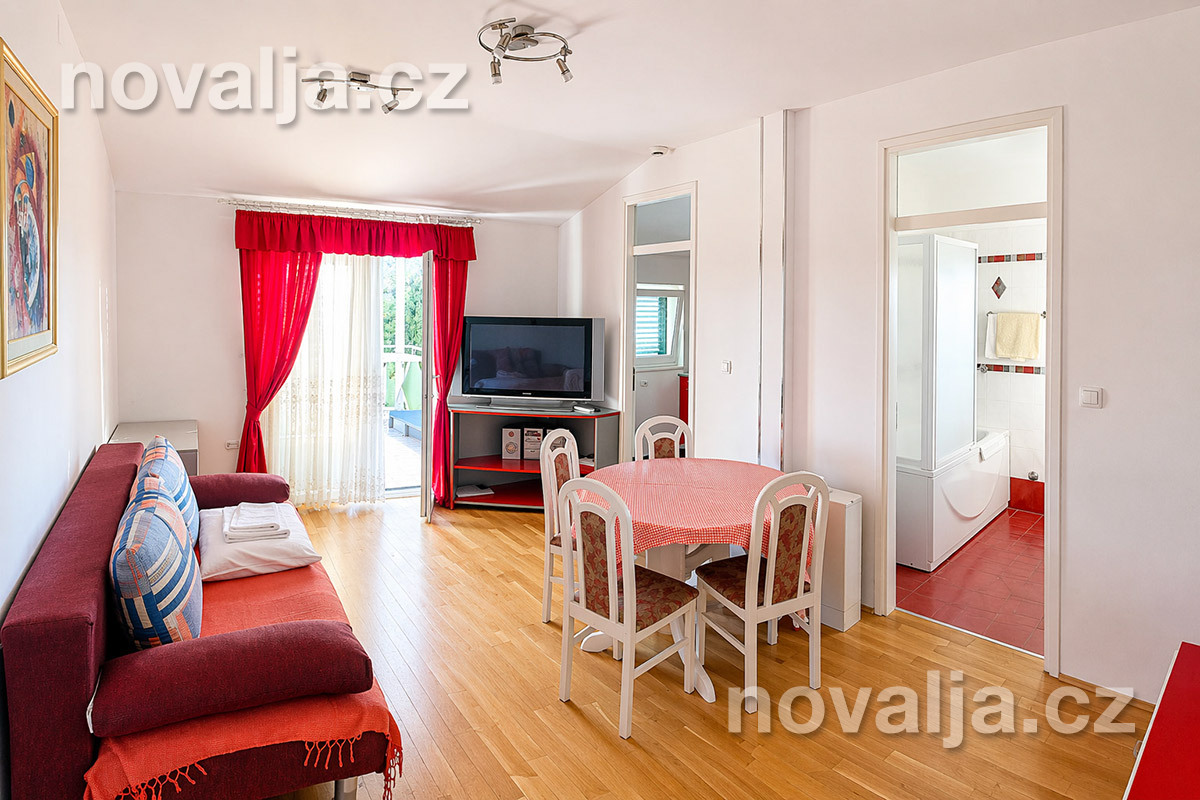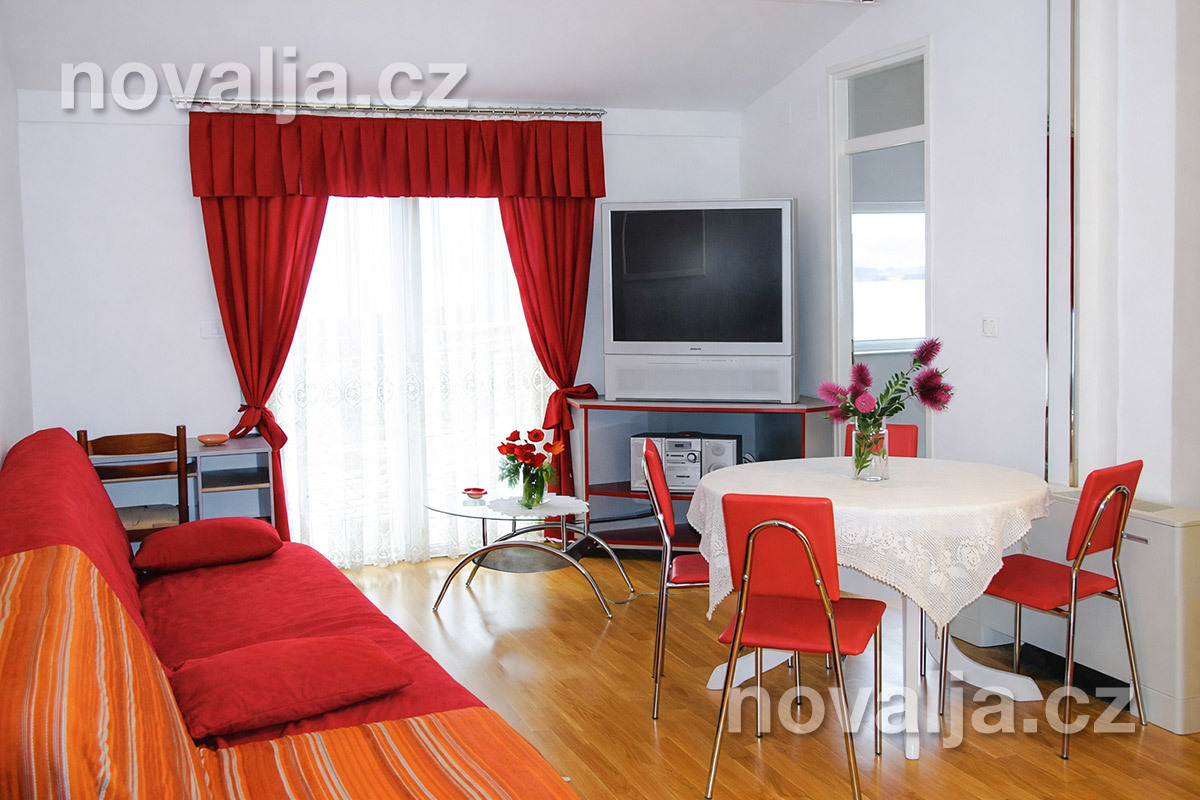 2 spálne s dvoma lôžkami, vybavená kuchyňa (chladnička, rúra, umývačka, varná kanvica), samostatná obývačka s rozkladacím gaučom pre 1–2 osoby, TV+SAT, fén, sociálne zariadenie s vaňou a WC, ďalšie samostatné WC, terasa s krásnym výhľadom na more. Klimatizácia (v cene).