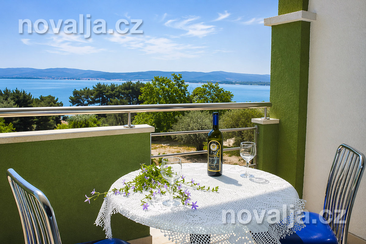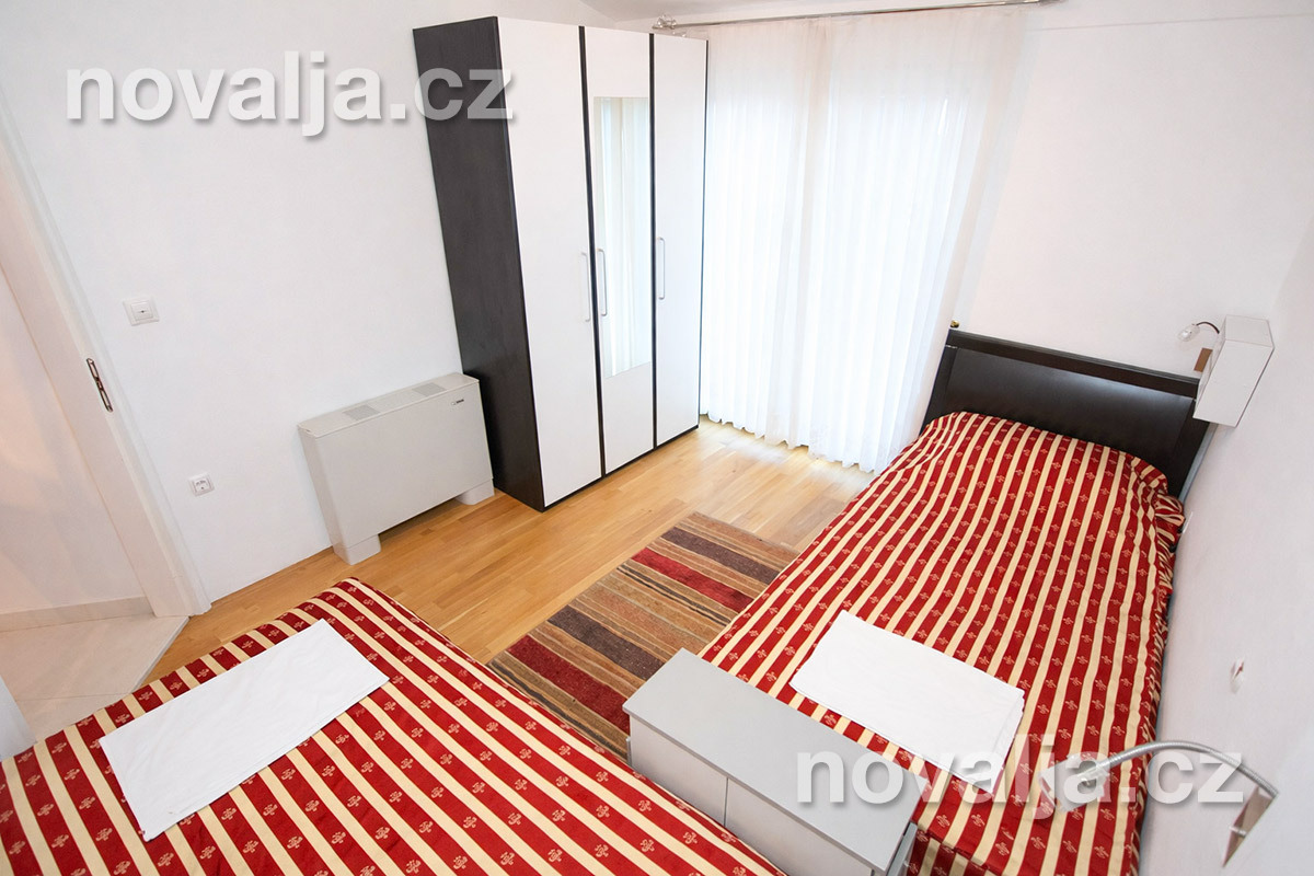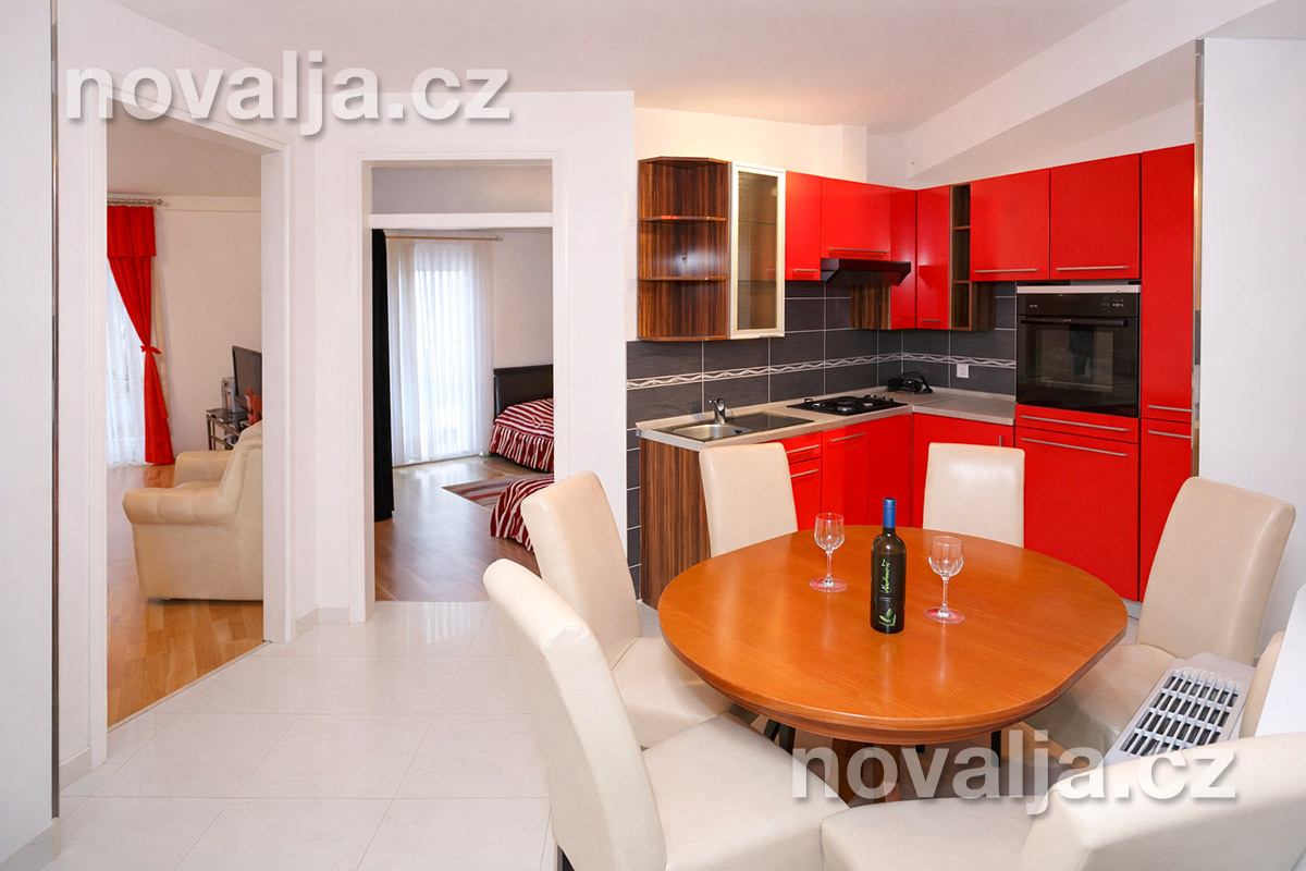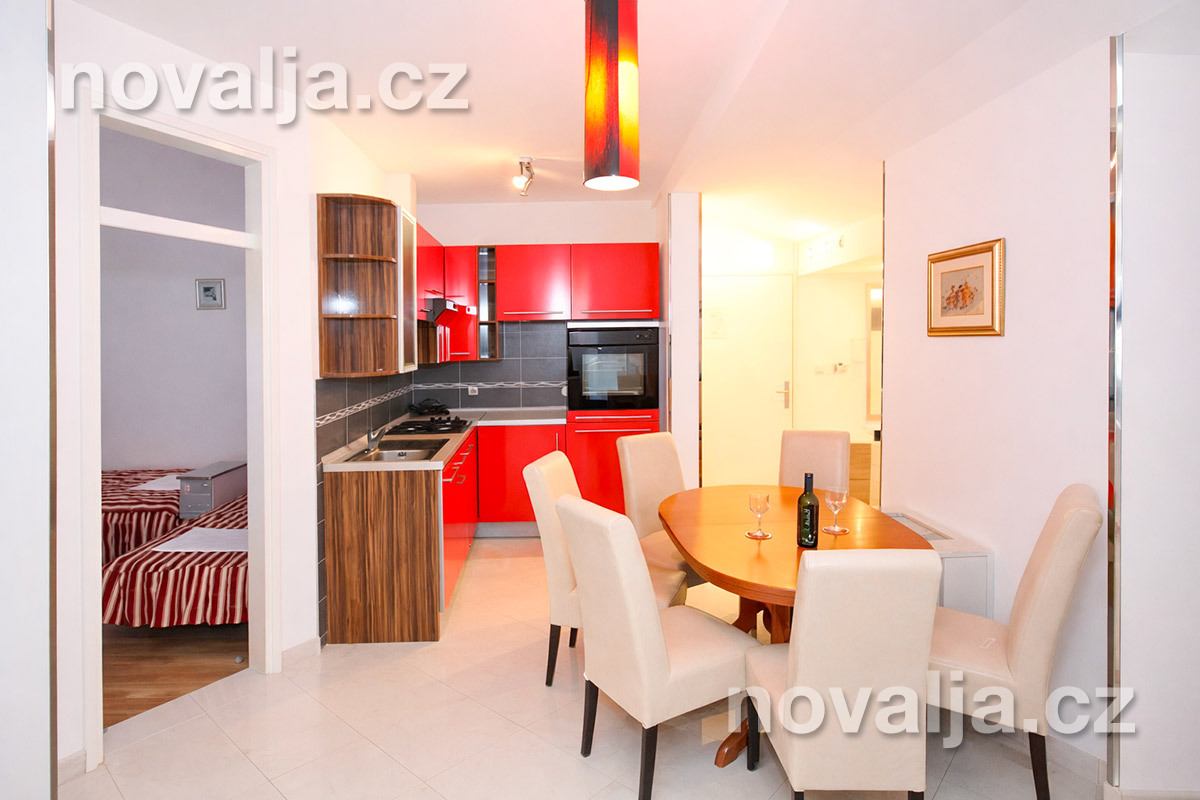 2 spálne s dvoma lôžkami, vybavená kuchyňa (chladnička, rúra, umývačka, varná kanvica), samostatná obývačka s rozkladacím gaučom pre 1–2 osoby, TV+SAT, fén, sociálne zariadenie s vaňou a WC, ďalšie samostatné WC, terasa s krásnym výhľadom na more. Klimatizácia (v cene).