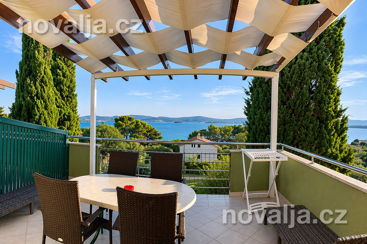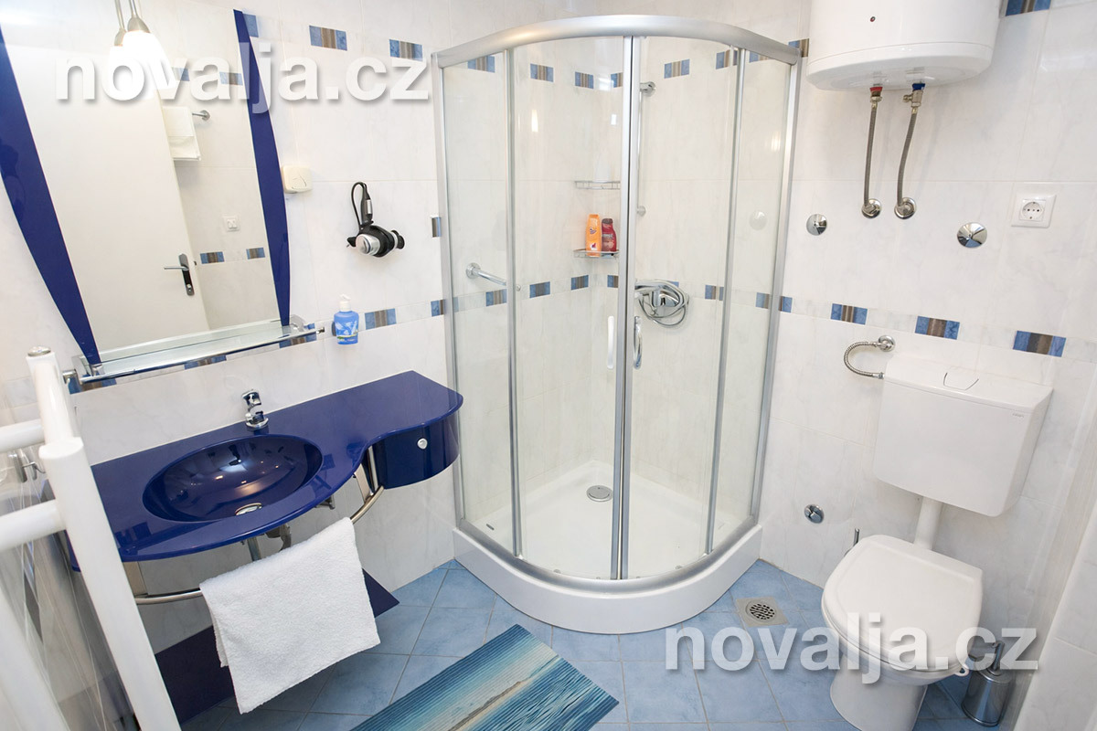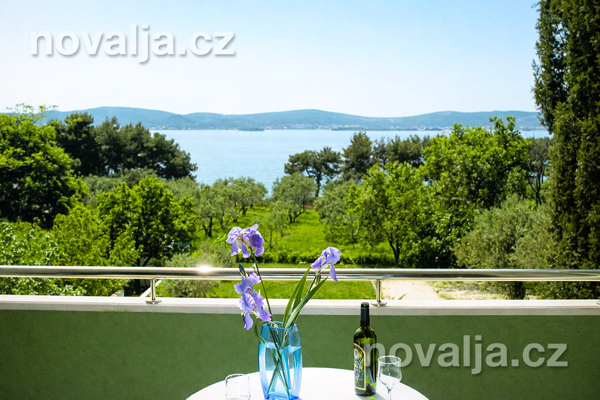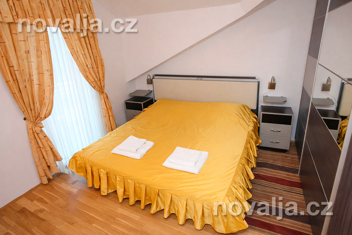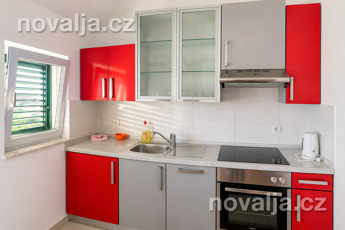 2 spálne s dvoma lôžkami, vybavená kuchyňa (chladnička, rúra, umývačka, varná kanvica), samostatná obývačka s rozkladacím gaučom pre 1–2 osoby, TV+SAT, fén, sociálne zariadenie s vaňou a WC, ďalšie samostatné WC, terasa s krásnym výhľadom na more. Klimatizácia (v cene).