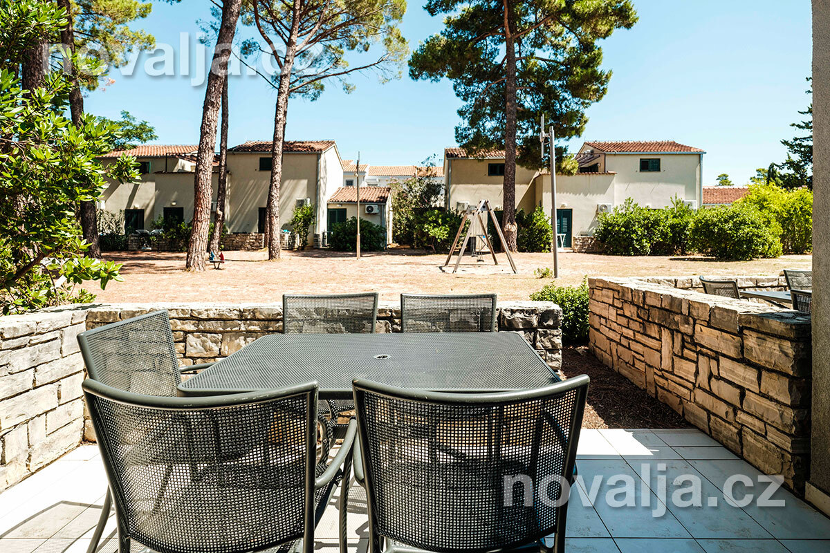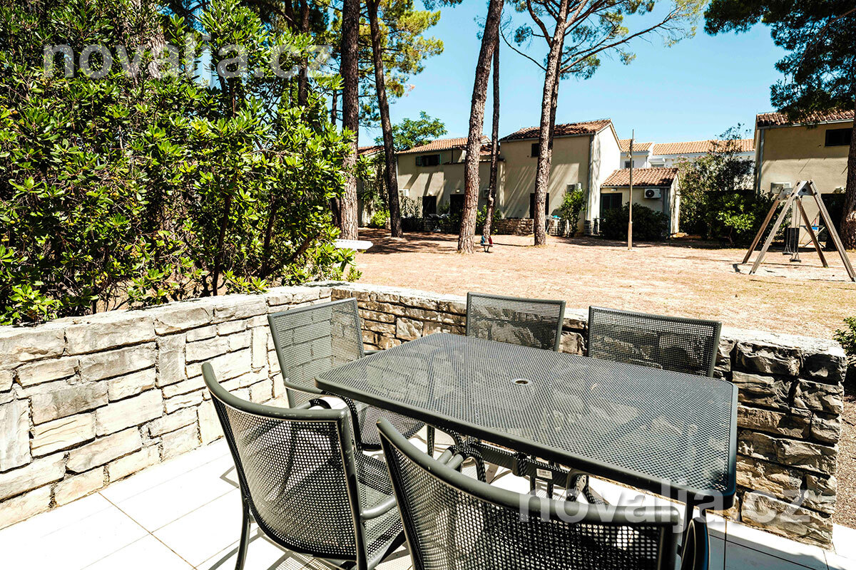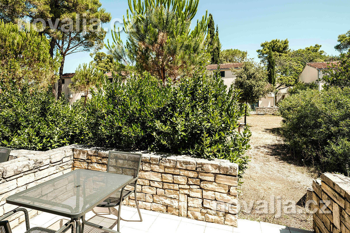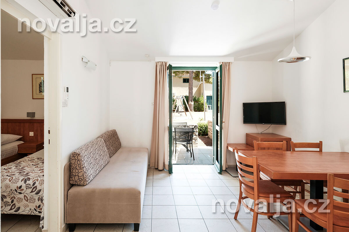 2 spálne s dvoma lôžkami - v jednej spálni manželská posteľ, v druhej tri samostatné lôžka (tretie lôžko na poschodovej posteli), vybavená kuchyňa (varná doska, chladnička, mraznička, mikrovlnná rúra, varná kanvica, kávovar) s rozkladacím gaučom pre 1 osobu, TV+ tienená terasa so záhradným nábytkom a dvoma lehátkami. Klimatizácia v kuchyni (v cene). Rozloha 34 m2 + terasa 26 m².