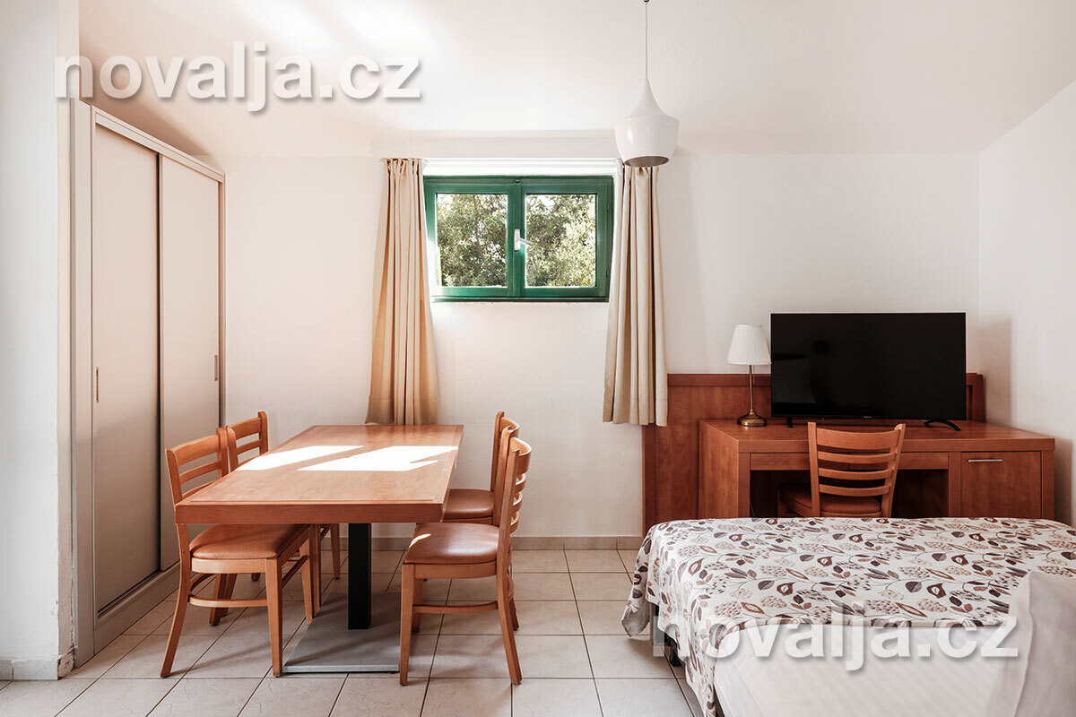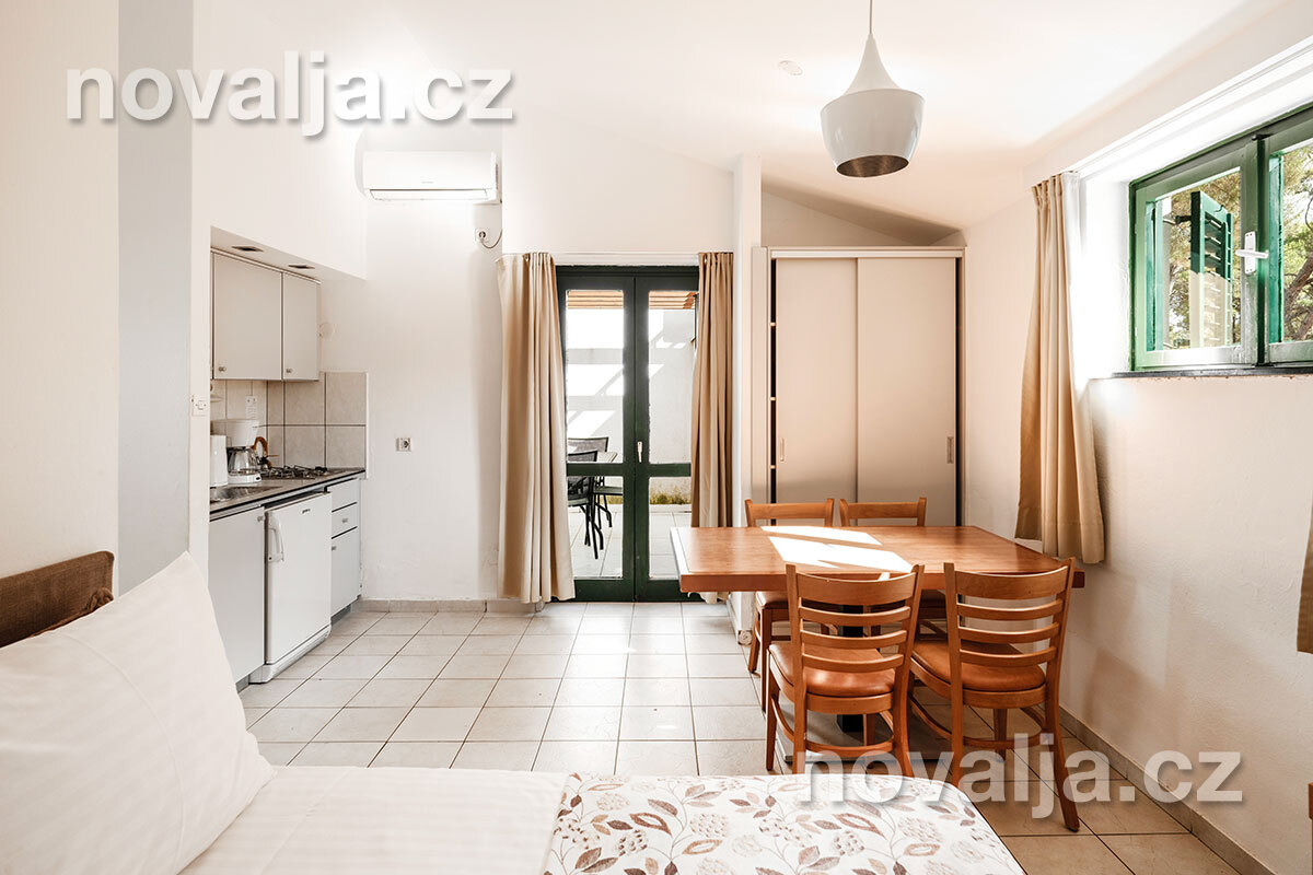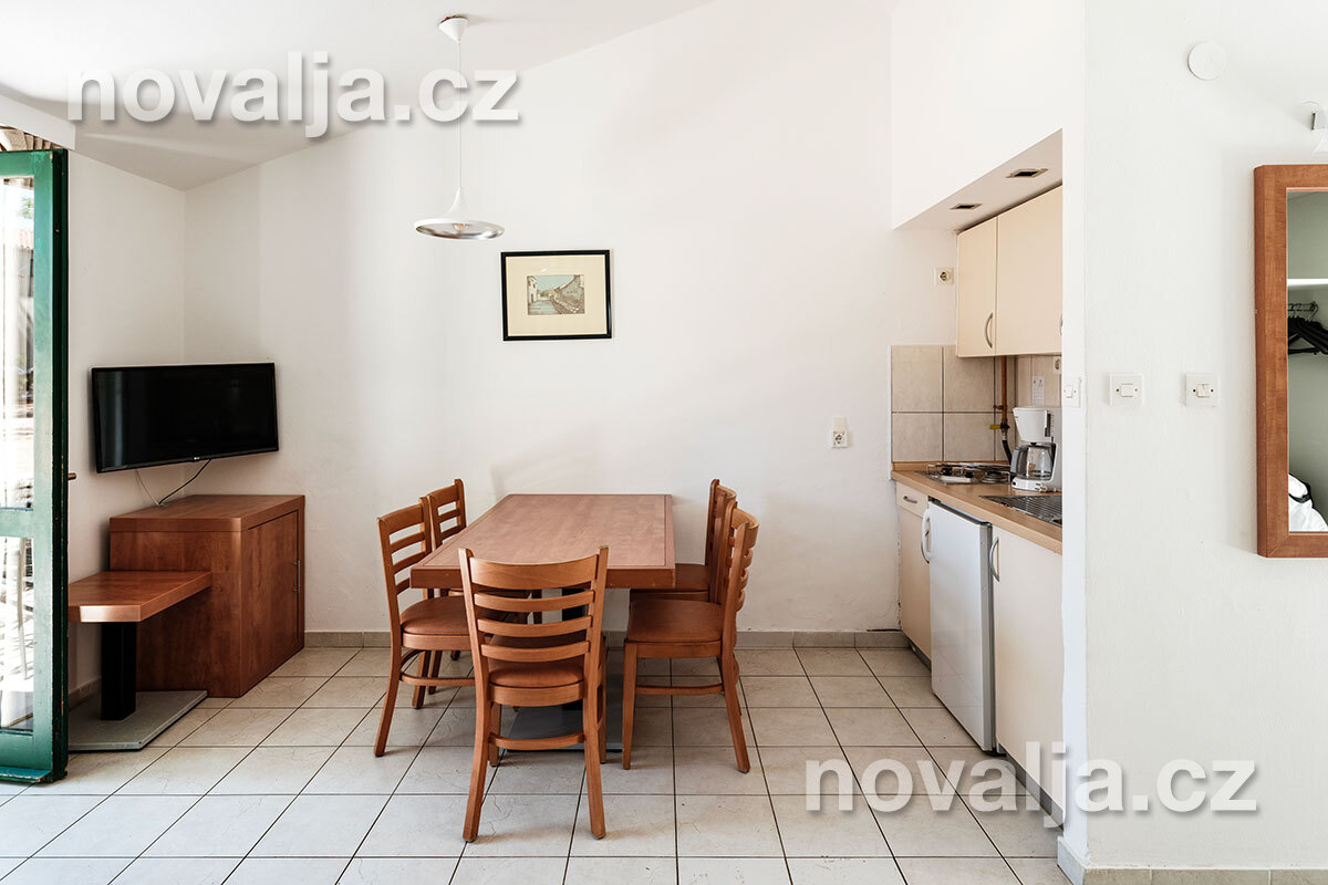 Studio (jedna místnost) pro 2 osoby, vybavený kuchyňský kout, sociální zařízení se sprchovým koutem a WC, TV+SAT, terasa. Klimatizace.