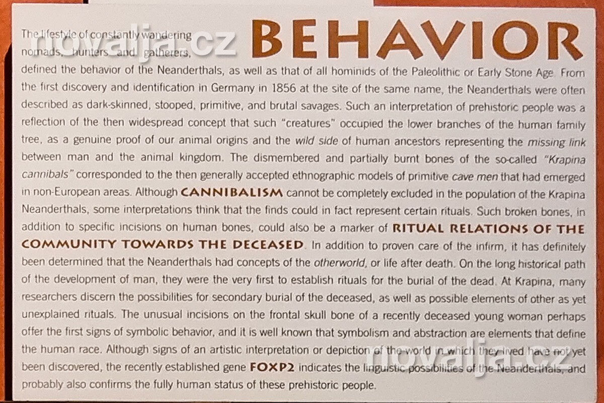 Expozícia pokrýva vývoj človeka od najstarších predkov až po moderného Homo sapiens, každodenný život neandertálcov – ako lovili, aké používali nástroje, ako vyzerali ich príbytky, informácie o objave a výskume náleziska v Krapine, realistické figuríny neandertálcov vytvorené podľa najnovších vedeckých poznatkov.